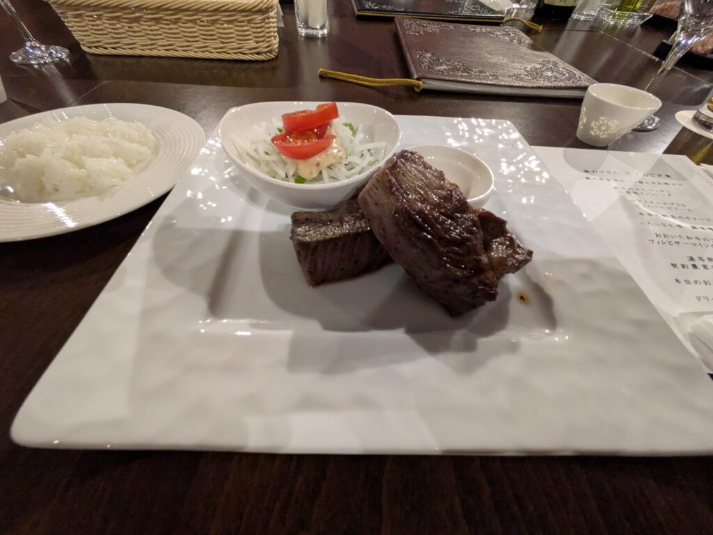 今夜の夕食は洋食でメインは、おおいた和牛のステーキフィレとサーロインの食べ比べでとてもおいしくいただきました。また参加者の中に本日がお誕生日の方がいましたので、幹事様がまたご活躍、散策中に有名なチーズケーキとローソクなどを購入され素敵なお誕生会が出来ました。