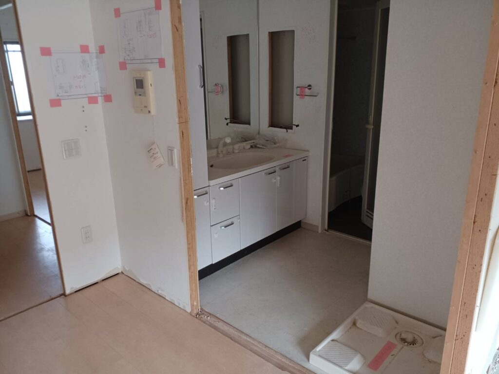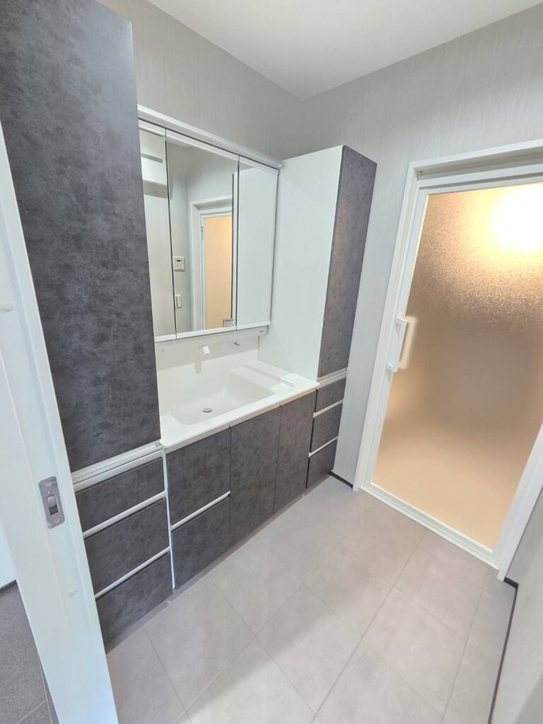 洗面化粧台はリフォーム前、1200㎜の洗面台と300㎜のトールキャビネット仕様でしたが、900㎜の洗面台化粧台に変更し300㎜トールキャビネットを左右に新調し、トイレ同様収納豊富となりました。写真には写っていませんが洗濯機置上段に可動棚を設置しております。