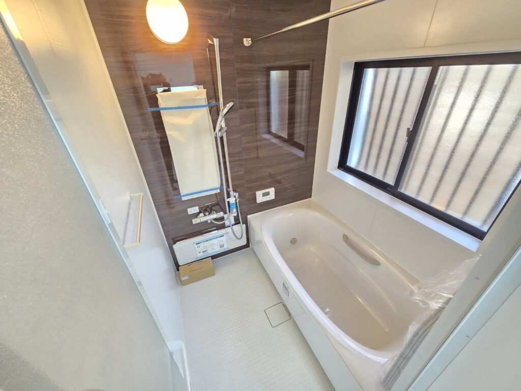 浴室は、1616(一坪サイズ)を新調してゆったりくつろげる空間になりました。出窓もついているので明るく、衛生的です。もちろん浴室乾燥暖房機、追い焚き機能付きです。